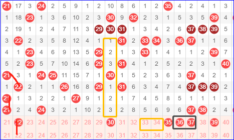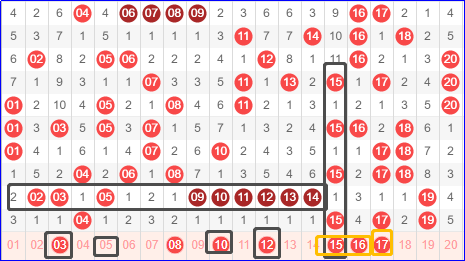 第一区间号码01-20,上一期咱们分析,六连号之后两种走势,一种出现重号,一种没有号码。这就是所谓的盛极必衰。而且号码14也是这样一种情况,提前出现导致走势中断。但是这一期大家可以再关注一下上一期开出的连号之类的,有返号的嫌疑。