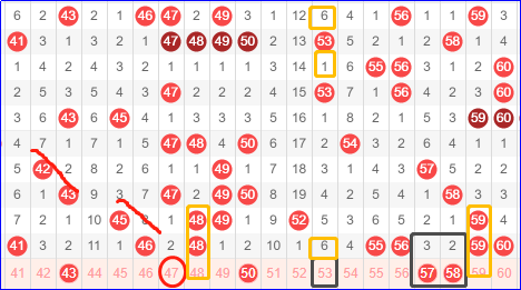 第三区间号码41-60,本区作为290期研究的重点,区间是完全正确的。可惜号码不是所想。号码43的3-2-1没有如期出现,47也没有完成跳空走势。这一期依然会是重点分析的区间。参照标注选号。