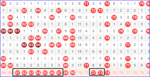 第四区间号码61-80,本区会是这一期的一个精彩区间,走势我们就不做标注了,但一定注意本区的所有空白遗漏区域。这将是本区或者是本期的一个经典。
