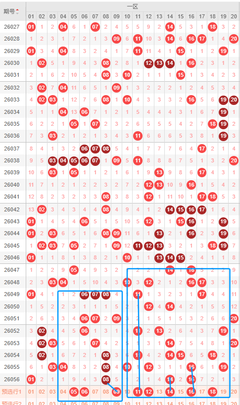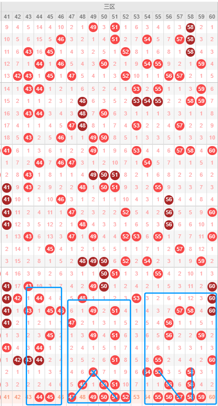 从近几期三区走势看,上期开了5码,温度上升,本期可能会上下浮动,建议关注28码左右;从整体走势看,目前三区中间的号码继续开的概率比较高,本期三区可以关注一下重号和连号,其次是右边的号码也可以继续关注;