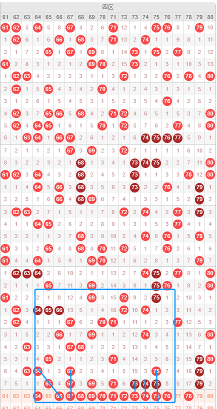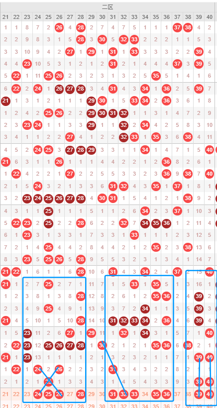 从近几期二区走势看,上期开了3码,温度下降;目前二区近2期比较冷门,本期热度可能也不会太高,可稍微防一下回补,推本期建议关注27码;从开号走势看,二区中间整体的号码已经空缺了3期左右了,回补趋势比较大,可关注一下;