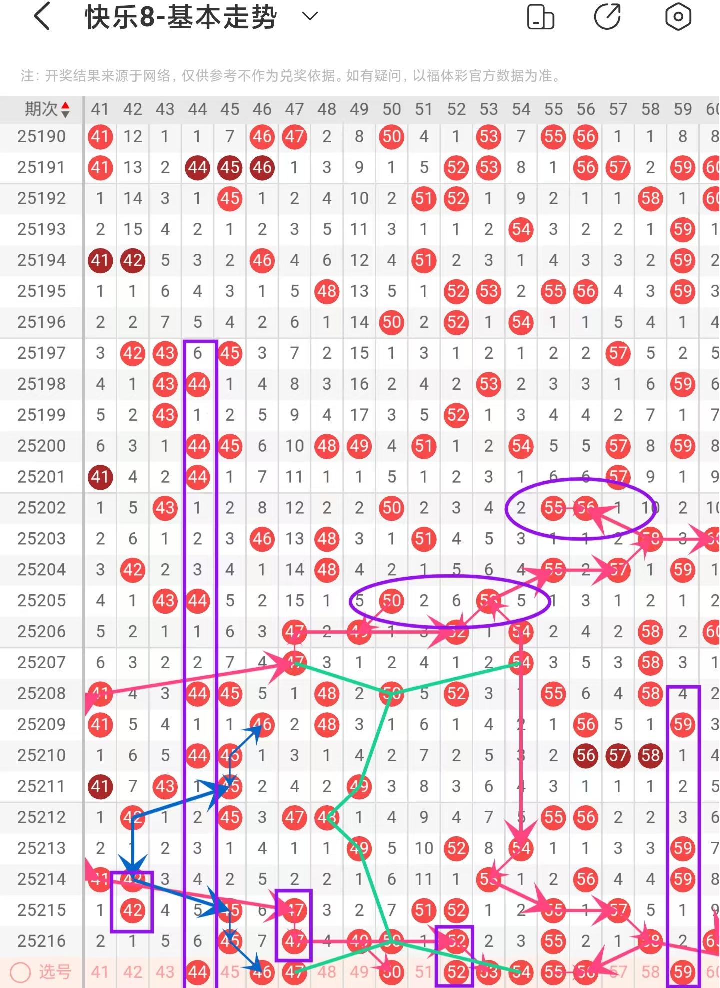 三区间上期稳定落号,一共开出八个号码球,本期考虑减少号码球的数量,注意防守百期相似形态的41号码球,以二区间的39号码球为对称走势起点,注意走势形态的50、53号码球,以42号码球为对称走势起点,注意走势形态的46、48号码球,以48号码球为对称走势起点,注意走势形态的47、54号码球,以54号码球为对称走势起点,注意走势形态的55、56号码球,阶梯落位重码走势注意52号码球,期数增减法注意43、59号码球,因此三区间关注44-46-47-50-53-54-55-56-59。注意本区间的选二44-50、47-56。