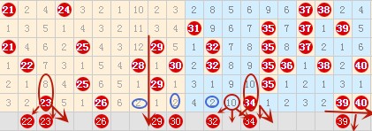 上期开出的23号数字属于小冷号,本期就关注它的重号和邻号出号情况,出号几率还是很大的。上图中29号数字形成了空一跳对称类型,可以参考一下。观察上图我们可以发现在26号到34号数字区间有3个同期遗漏值的数字,所以本期的28 30 32也是我们重点作防对象。上期开出的34属于冷号类型,本期我们就重点作防它的重号及邻号了,所以32 33 34 35我们也是要重点作战的,这里出1-2个号的几率很大。上期开出得39 40 42号这种连号空一带号的类型也是要重点关注的,这种类型的组合号在前面文章中说过落号几率还是很大的,这里我们就选39号数字做参考吧。