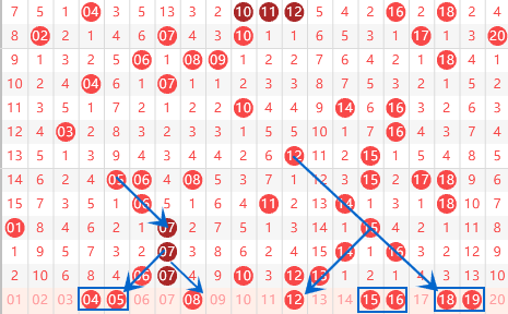 本期的04号数字是属于遗漏8期的号码,由于上期遗漏8期的号码没有开出来,本期出号机会就大了,所以本期的04 31 52应该会出一个号码来,我们可以重点考虑一下。本期的08 28在尾数上是属于中心对称回补号码,本期我们要注意同时出号的情况。连号空一代号10 12 13号数字我们要注意出重号的情况。18号数字是属于断斜连号对称,本期可以关注一下。
