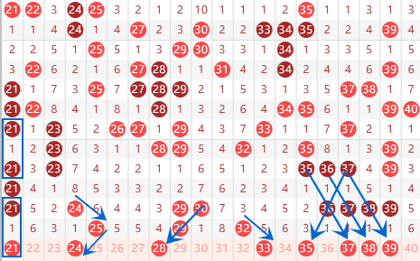 该区间的21是属于重号空一对称,本期可以关注意一下。本期的28号数字是属于三斜连号码,本期我们可以关注一下。本期的33号数字也是可以关注一下的,是属于三斜连号的回补号。上期的4连号36 37 38 39号数字没能出重号,本期应该是要回补号码的,重点考虑一下37 39的出号情况。