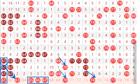 上期开出了07 61 62 73这四个3重号,本期我们要注意出现4重号的情况了,重点考虑一下61 62号数字出现4重的情况。连号65 66 67遗漏3期了,本期落号机会很大,也可以在这里抓一胆码出来的。本期的70号数字是属于梅花号码,也是可以关注一下的。