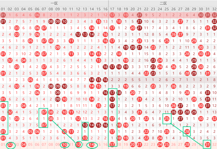 本期一区胆尾2尾4尾,预判一区要热,边号连出7期上期中断看好今天回补,那么今天边号只有2 12 14三码要出一码,2尾12形态比较好看8 10 12组成连号,上图已勾画,这种太明显的号更看好同尾号2,14是边号14不喜欢可以试试同尾号4,隔一期号连出4期所以本期隔一期号看5.6.10.11出一码,本期一区关注五码2 4 12 10 11