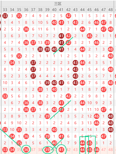 三区胆尾3尾锁定33,上期3尾中断,预判本期回补在三区,三区隔二期号算周期今天要出只有33 48,看好33,不喜欢33就试试48,重号连断二期,本期看好重号回补,35 40 44 45出一码5尾近期最热看好45,近期都有边号本期接着看34 36 39 41 43 44 45 46要出1-2个,形态上34 36 39 41比较好看,上图已经勾画4码出一码,近期趋势冷号连出3期,本期只有43,不看好43就试试同尾号33,本期三区看好四码33 34 45 48