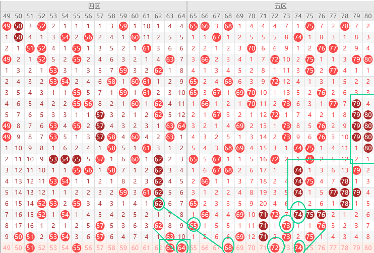 五区胆尾8尾2尾,锁定68 72,形态上74比较好看,74 75 76组成三斜连,上图已经勾画,重号连出二期本期接着看重号69 71 73 75要出号,73 75概率最大,最近趋势三直落都是连出,像上面三直落四直落74 78跟79 80都是连出,你看形态71 73是不是跟上面三直落一样,上图已经勾画,每期都有边号本期边号68 70 72 74 76看好68 72 74,74是4尾最热又是三斜连形态,上图已经勾画,上面76重号下期出左边号,同理上期73出重号本期左边号72,形态上68跟65 62组成三斜连比较看好,本期关注四码68 72 73 74