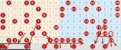 上期开出了2 3号这个连号,回顾历史期数中,开2 3号数字之后是容易开出1号数字的,所以这里我们必须要防着。以前就说过2 3 5号这种类型的组合号码是最容易落号的,这里我们也要布防的,所有我们可以从1 2 3 5号数字里定一胆码了。上期在该区间开出9 10 11 12 13 14号这个六连号,那么本期在这里会不会断号呢?所以我们在这里做防守就行了,定胆风险太大。上期开出的三斜连有好几组,那么本期大概率会开出斜四连的,所以10号数字我们必须防着。13号数字与前面的14 15号数字形成三斜连,也是要参考一下的。在上期中15 17 18号这中类型组合号码没有落号下来,那么本期这里是有号的,在这里也可以定胆的。