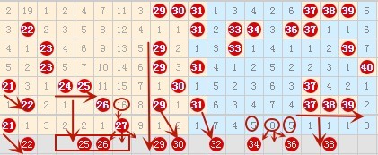 上期在该区间只开出了2个号码,本期可以放心的在该区域作战了。预测本期应该有5 6个号码会开出来。21 22号数字这种类型的组合也是容易开出来的,这里可以关注一下,在前两期中24 25号这个连号没落号下来,本期应该要落号了,上上期的冷号26号开了它的邻号27号数字,也是一个冷号,所以本期的26 27 28号数字也是会落号的,我们就可以从24 25 26 27中定一胆码了。29 31号数字都是重号对称类型,这里我们选29号数字作为参考就行了,重点还是放在37 38 39号这个三连号上面,在上期这组三连号没落号下来,那么本期落号的概率就大大增加了,这里也可以定胆码的,但是没有参照号码,我们不好确定落谁的概率要大一些,所以还是做防守好一些。