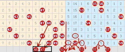 在上期中同时遗漏8期的号码有四个,所以本期开出遗漏值为8的号码概率还是大的,我们可以做一下防守,这里的46号数字就是此类情况,可以关注一下。47号数字是空一跳对称类型,参考就行,落号的几率也是有的。上期开出49号数字属于三重号,所以本期的48号数字也要关注一下,会落下重号的,所以我们就可以从46 47 48号数字中定一胆码了。上期开出了52号数字这个大冷号,那么本期我们就要注意它的邻号情况了,开出概率很大的,51号数字属于冷号类别,尽量避开它去作防吧。