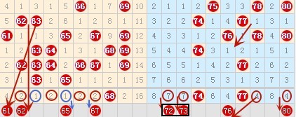 在上图中68号数字之前的遗漏值相同的有两组,号码分别为62 64 66 67号和63 65号,这里面本期也是要有号码开出来的,在上图中可以直观的看到62 63 64号这个三连号和66 67号这个两连号在上期没落号下来,所以本期这两组号码有号开出的概率很大,以此我们就可以推断落号范围就在62 64 66 67中了,可以在这里定一胆码了。72 73号这个连号已经同时遗漏7期了,本期在不落号就转成冷号了,所以本期落号的概率很大,可以在这两个数中定一胆码的。好了,本期分析就到这里了。