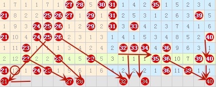 上期中说过24 25 26号这个三连号是要落号,上期既然24 25号数字同时落下来了,那么我们可以暂时放弃这里了。22号数字已经变得很冷了,选号我们一般都是避开冷号去作防,可以从它的邻号下手。上期又开出20 21号这个二连号,连号旁边又是冷号,所以20 21号这个连号本期是要落号,可以重点考虑。再来看上图中的23 25 27和24 26 28以及26 29 32这三个三斜连是必定要出一个号的,这里可以重点考虑选一胆码。上图中32 33 34号这个横3连上期没有落,那么本期应该是要落下一个号码来的,如果本期不落号,那么下期我们就可以在这里定胆了。