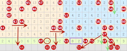 在41-60号这个区间不好选号,近期内应该还有一次大反弹现象,近几期内我们选号定胆还是尽量避开该区域吧。在上图中43 44这个两连号已经同时有3期没落号了,本期可以选一号码做防一下,但是不建议定胆。本区域还有一个最大遗漏值48号数字,这个可以做一个防守。49 50这个两连号也是同时有两期没落号了,如果本期还是不落号,那么下期必然要落出一个号码来。本期可以做一下防守。51-60号数字这个小区间有转热趋势,这会不会是一个烟雾弹呢?我们还是尽量避开该区域定胆吧。上图中52号数字有明显的转冷趋势,我们可以在它的邻号上下手。本小区间上期开出了5个号码,按照概率学来说本期应该至少是要有一个重号的出现的,除非本区域只开1个号码,57 58数字近几期内比较热,所以我们要选重号可以再此下手作防。