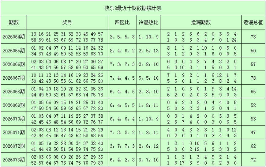 福彩快乐8第2026073期奖号为:02 03 06 08 09 20 26 27 29 35 52 57 64 67 73 74 75 76 79 80,其中奖号和值为862,跨度为78,四区比为6:4:2:8,奇偶比为10:10,遗漏总值为72,奖号冷温热码个数比为3:7:10。