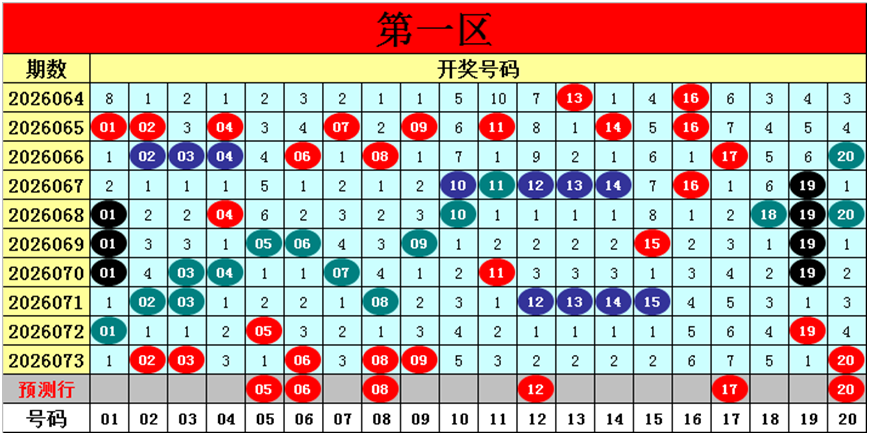 目前第一区包含13个热码:重码6个02、03、06、08、09、20,邻码3个01、05、19,孤码4个12、13、14、15;包含6个温码:邻码3个04、07、10,孤码3个11、16、18;包含1个冷码:邻码0个,孤码1个17;号码冷温热个数比为1:6:13,重号、邻码、孤码个数比为6:6:8。