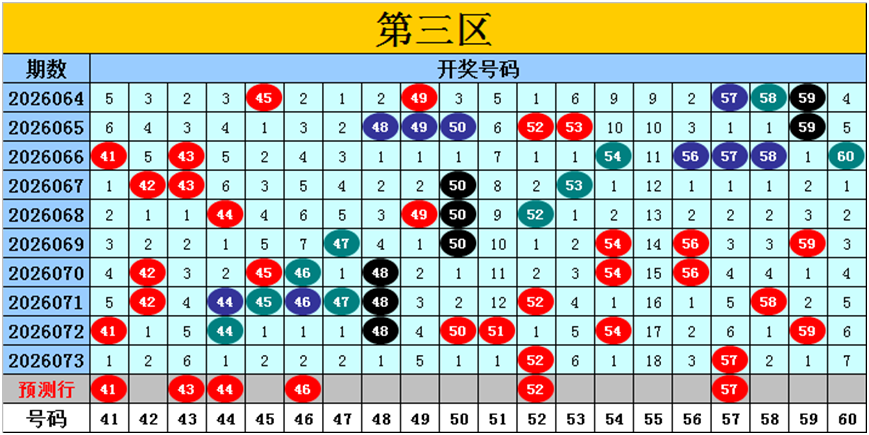 目前第三区包含14个热码:重码2个52、57,邻码2个51、58,孤码10个41、42、44、45、46、47、48、50、54、59;包含4个温码:邻码2个53、56,孤码2个43、49;包含2个冷码:邻码0个,孤码2个55、60;号码冷温热个数比为2:4:14,重号、邻码、孤码个数比为2:4:14。