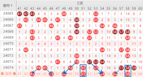 上期开出了44 45号数字,本期我们注意一下出边号的情况,重点关注一下46号数字的出号情况。上期开出了49 51 54号数字的出号情况,本期我们注意一下51号数字走重的情况,这里可以防守一下48 51 54号数字同出的情况。本期的56号数字我们注意一下出号情况,可以防守一下56 68号数字同出的情况。上期开出了57 58 59号数字的三连号,本期我们注意出一个重号的情况,重点关注一下57 58号数字走重的情况。