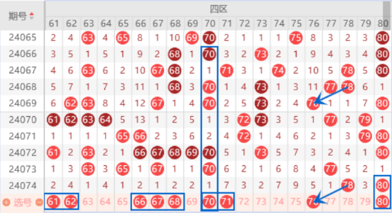 本期的61号数字是属于4斜连号码,可以做一下防守。本期的62号数字在尾数上是属于7斜连号码,出号机会也是有的,可以防守一下61 62号数字同出的情况。本期的66 67 68号数字我们要注意出连号的情况,本期的67 70 77 22号数字都是属于212走势,本期我们注意一下出2个号码的情况,重点关注70 77号数字的出号情况。上期开出了78 80号数字,我们注意一下出一个重号的情况,73 76号数字我们也是要注意出一个号码的情况。