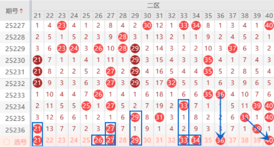 该区间上期开出了21 27 39号数字,本期我们注意出一个号码的情况,其中的21 27号数字可以重点关注一下。本期的26号数字是属于空三对称号码,是有机会出号的,我们可以关注一下出号情况。本期的28 29号数字我们注意出一个号码的情况,其中的29号数字我们可以关注一下出号情况。本期的33号数字我们注意一下出号情况,本期可以防守一下33 34号数字同出的情况。本期的36号数字我们注意一下落号情况,本期可以防守一下36 40号数字同出的情况。
