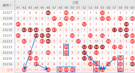 该区间的42号数字我们注意一下出号情况,本期可以防守一下42 49号数字同出的情况。本期的46号数字是属于212走势,出号机会是有的,我们可以关注一下46 48号数字同出的情况,本期的48 49 50号数字出号机会是有的,我们可以重点关注一下。本期的54号数字我们注意一下出重号的情况,毕竟52 53号数字都是属于重号。本期的58号数字我们注意一下出三重的情况,本期可以防守一下55 58号数字同出的情况。
