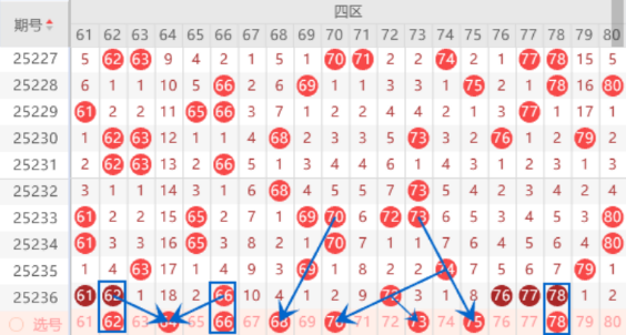 该区间上期开出了60 61 62号数字的三连号,本期我们注意一下出重号的情况,其中的61 62号数字可以重点关注一下。本期的最大冷号64号数字注意一下出号情况,本期可以防守一下61 64号数字同出的情况。本期的68 70号数字都是属于三斜连号码,本期我们注意出一个号码的情况。本期的73号数字我们注意一下出号情况,毕竟上期开出了72号数字,本期是有可能走分边的。上期开出了76 77 78号数字的三连号,本期我们注意一下出一个重号的情况,其中的78号数字我们可以重点关注一下。