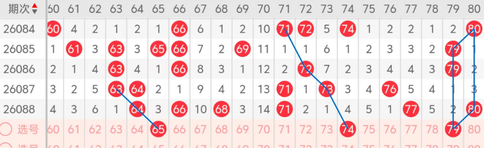 第四区间的走势分析:第四区间上期开出了六个号码球,主要的落号点位在四区间的前后半区,走出了两奇四偶的形态走势,上期四区间的前半区落下了三个号码球,后半区落下了三个号码球,整个四区间处于走热的趋势,根据四区间的走势规律,今天的四区间我们主看前半区65的落位,再看后半区74 79的组合,74走出了斜连对称的走势,79走出了对称的走势,这三个号球建议大家打个三胆拖,或者打个三码复二比较稳妥,参考为主!