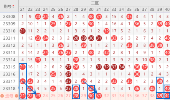 本期的22号数字我们要注意走三重的情况,防守一下22 23同出的情况。上期开出了25 27 28 29号数字,本期我们要注意一下出重的情况,重点关注一下28 30号数字的重号。上期开出了36 38 40 42 44号数字,这种5连空一开出的号码,我们就要注意一下出一重一夹的情况,重号关注一下40 44号数字,夹号关注一下39号数字的出号情况。这里还有一种情况,25-30号数字有可能断号,那么36-44号数字之间出3个号码,要么36-44号数字之间断号,25-30号数字之间出2个号码,这种情况我们要注意一下。