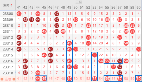 上期直播间就说了45 46 47不一定出号,我们做观察,不出我们本期在来定胆码,所以本期我们要在45 46 47之间定一个胆码出来的。本期的49号数字我防守一下出号情况,这里应该会开在47 48号数字之间,毕竟遗漏7期的号码有2期没有出号了,本期应该是会出一个号码的。本期的连号54 55号数字要注意落下一个号码的情况,本期的57号数字我们要注意一下走4重的情况,防守一下55 57在次开出的情况。