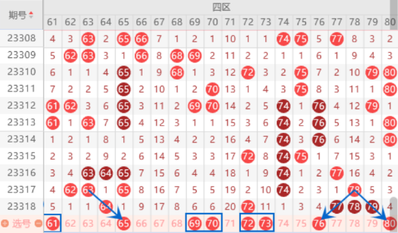 本期的61号数字我们要注意一下,由于上期没有开出来,本期有可能会补上的。本期的62 63 65号数字我们做一下防守就行了,这里存在断号的风险。本期的69 70号数字我们防守一下出一个号码的情况。上期开出了72号数字,本期我们注意一下分边的情况。上期开出了77 78 79三连号,本期我们注意一下出重的情况,当然分边的76 80号数字我们也是要注意一下的。