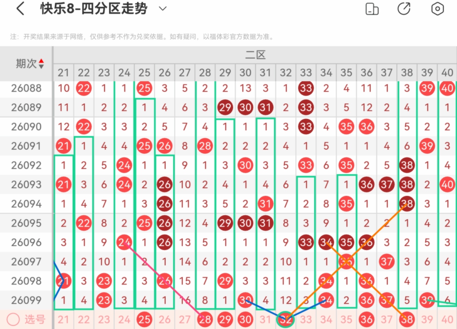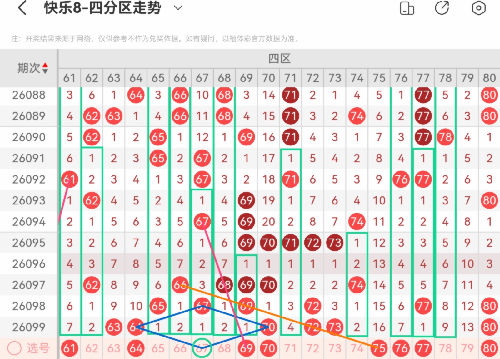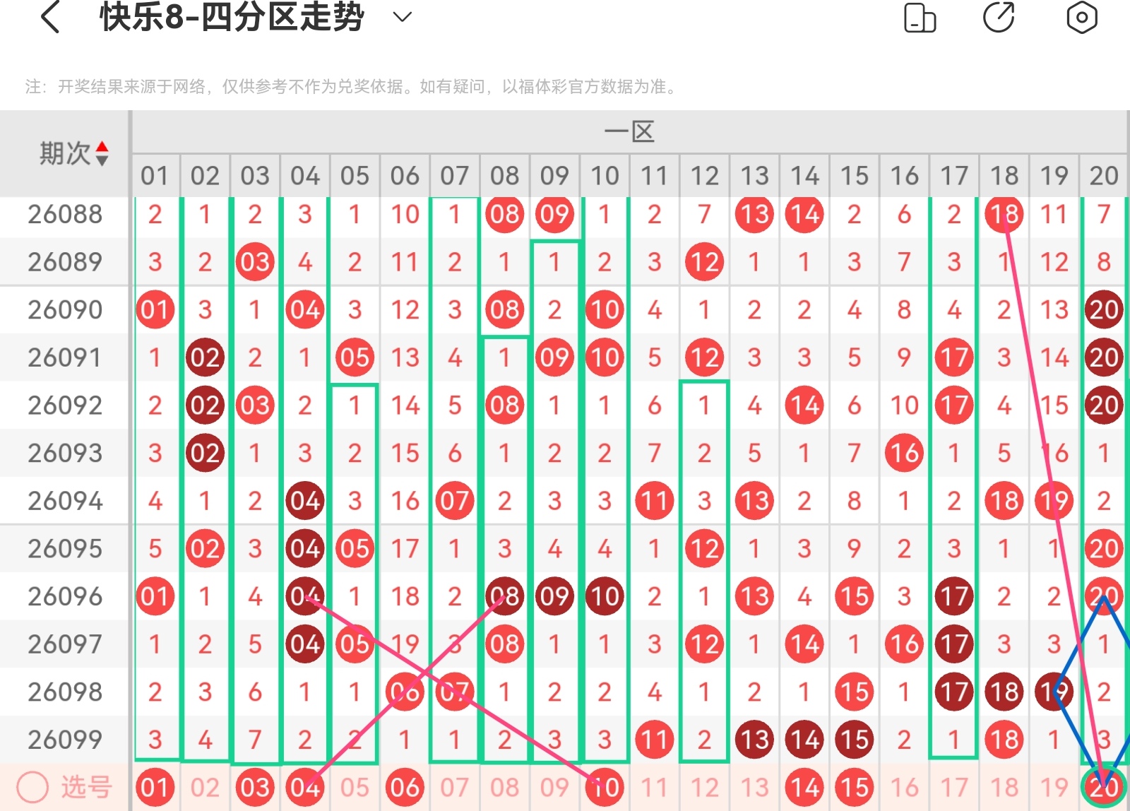 快乐八第26100期基本走势分析(上期会员文章选二追号两期中)