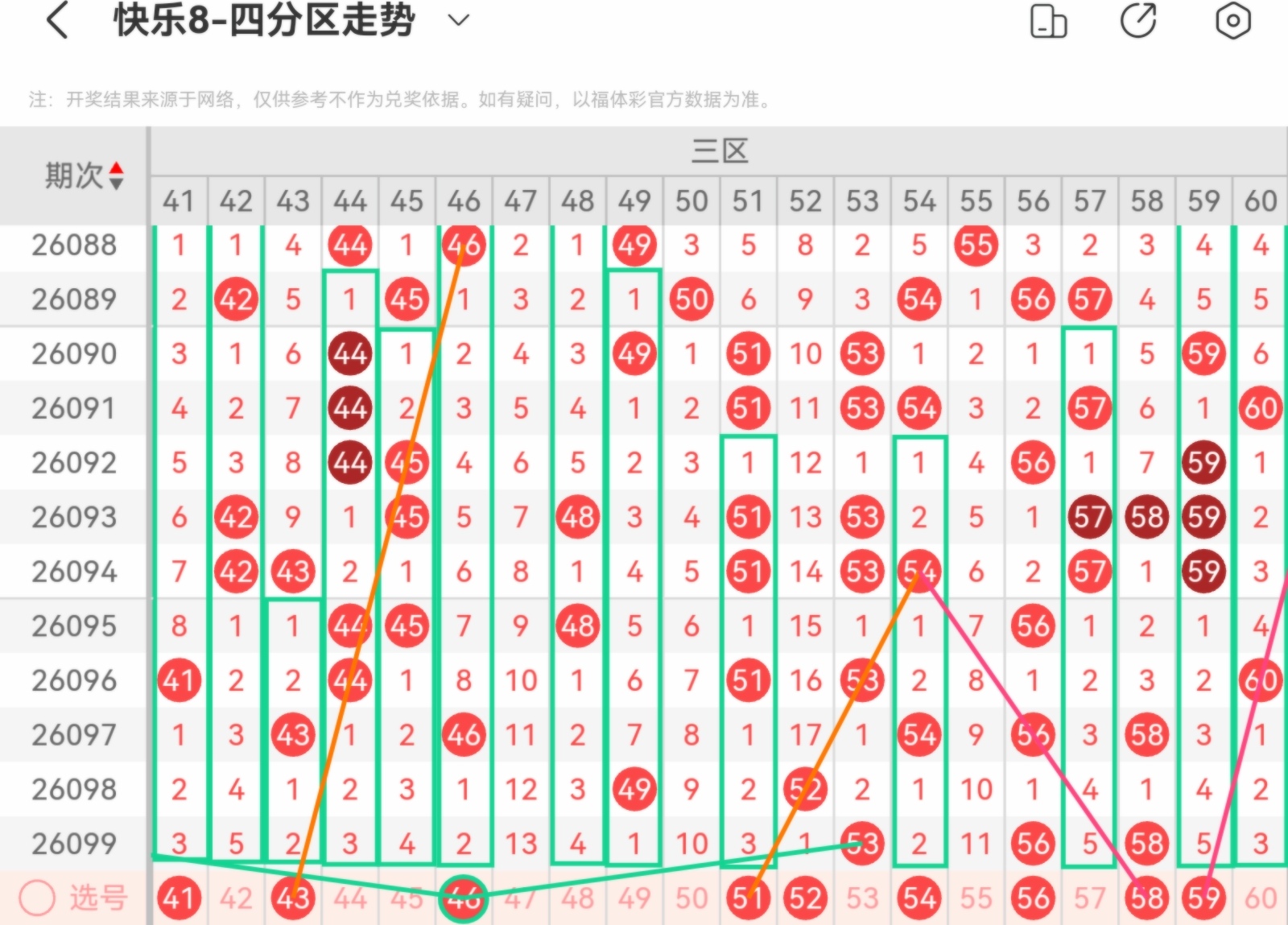 大家好,我是甜丝丝的坏事,主要以快乐八的形态走势、空位走势、遗漏走势以及斜连走势相结合的方法,用公认的四分区走势来进行预测分析,希望能让你有所收获。