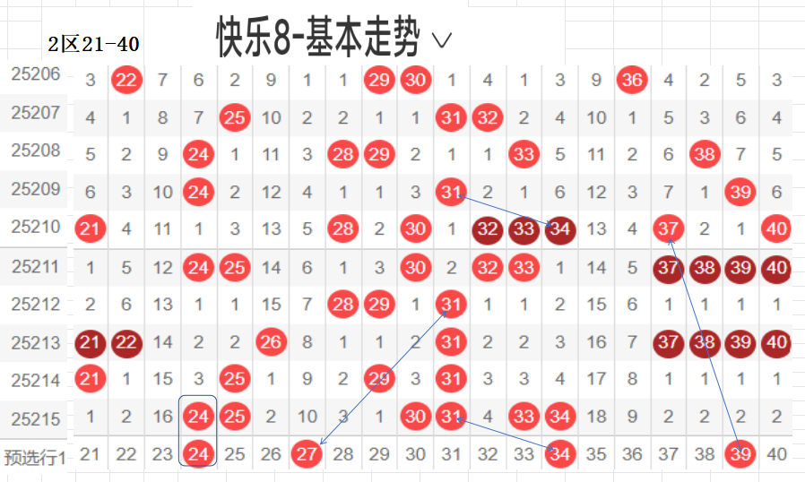 二区(21-40):遗漏5期以下有16个,0码24 25 30 31 33 34 6个,数据所示,冷码平均,选择条件增多了.上期开出了6个号码,出码比较分散.这期布防相应增加,重码按比例落这区较少,先给出重码30,这个区间间接走势,温区,21-30区间上期开了3个,依旧不是重点选号区间,31-40区间开出3个,本期关注热码的回补,间隔小遗漏值最佳,3字头转热,这个小区热码注意回调,可以做关联码的布局,注重温冷码的回补.