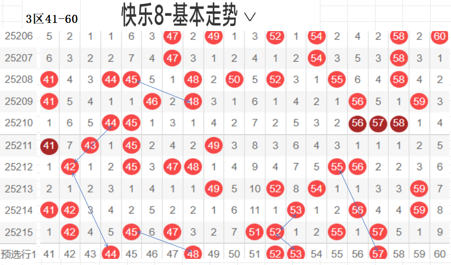三区(41-60):遗漏5期以下有17码,0码42 45 47 51 52 55 57 7个,温开方式,这区码数有回暖之意,可以防一手,先定胆码走势较大者,隔期,斜三连,分边号码,可重防,间隔5期以上号码可以随走势选取,例如本期大冷码,走势比较大,可以做胆,通常联动可带出,分边对称的号码,本区间也有很大走势.可关注下.隐形夹角号码.做补位形态号码.都需要观察动态走势.以上是本区间的选码方法.