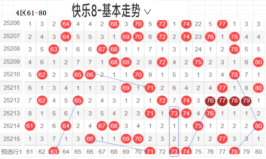 四区:(61-80):遗漏5期(含5)以下有19码,0码66 69 70 77 4个,平均温开方式,上期开出4码,区间回暖,后区可防,四区间从以往数据来看,重码很强,一枝独秀的存在,近期有回补走热的趋势,区间回暖后,本区间后区可防,与一区相比,也是温区.,对称下落码,隔期回补码,可以防守,这区对呈对称三角关系的胆码,斜三连有走势的胆码,联动落位码,都有各自的走向落位关系,根据走势选择一种方式选码.