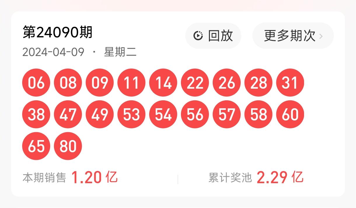 首先回顾上期的开奖号码:06 08 09 11 14 22 26 28 31 38 47 49 53 54 56 57 58 60 65 80
