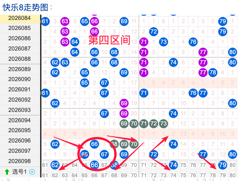 上期四区间开出了6个奖号(65.67.69.72.77.80)上期的四区开6个奖号呈现了一个不变趋势,开出的奖号6头回补3码,7头回补2个,先来看号码62在近 30 期内属于还是稳定的号码,近期出现频率相对温热,偶尔会间隔多期后出现一次,这个号码要注意防守,号码66具有一定的间歇性近期活跃度是很稳定比如有时会间隔3到8期就再次出现,有时会间隔多期,近期整体出现频率比较热,近期还是要关注的.号码74活跃度近期比较稳定,有一定的间歇性,整体走势有一定的波动性.