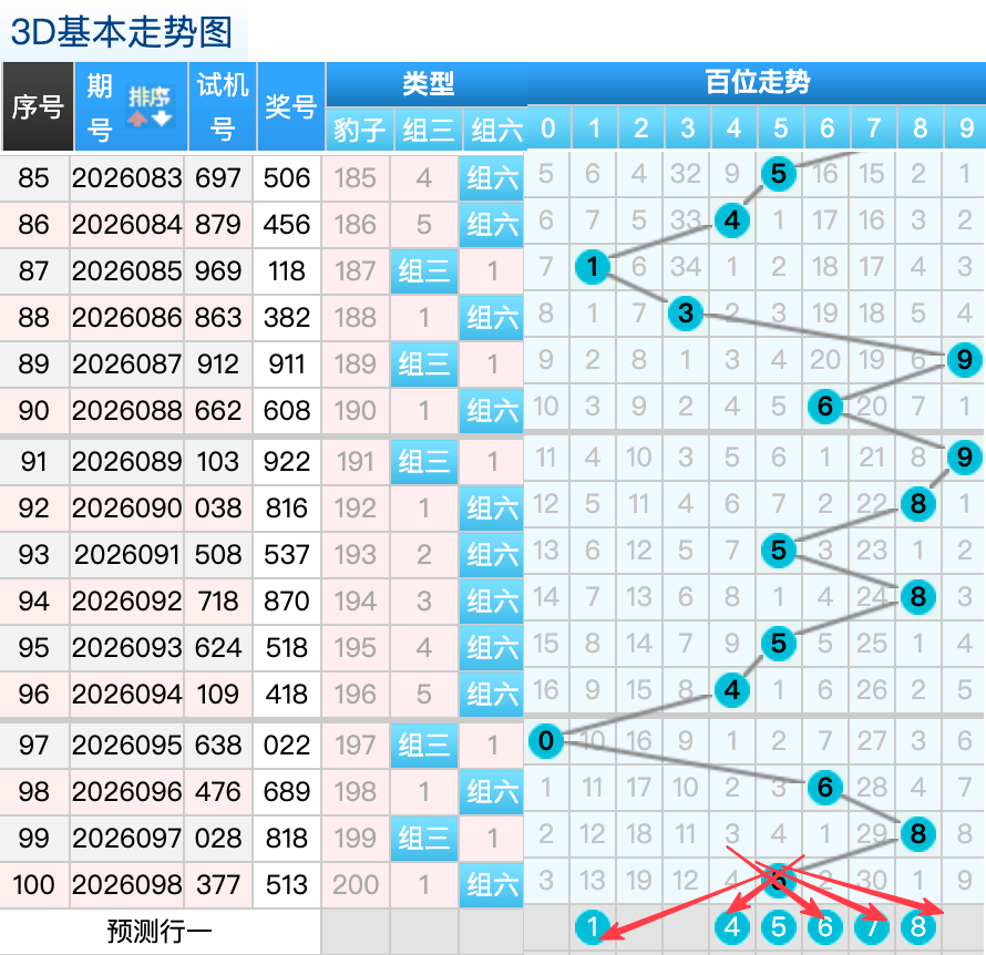 3D上期百位开出5号球,这个奖号5是一个热码的回补落位趋势也是一个比较好的符合百位上的落位点,先看8号球这里还是有机会继续走出一个热号码的落位趋势还是要注意防守的,还有一个就是7号球这里的是2跨落位形态在这里的机会还是很好的要注意防守,然后1号球这里要注意是一个4跨的冷码回补落位趋势注意防守,5号球在百位上要注意可能有机会走出重码的回补概率 。