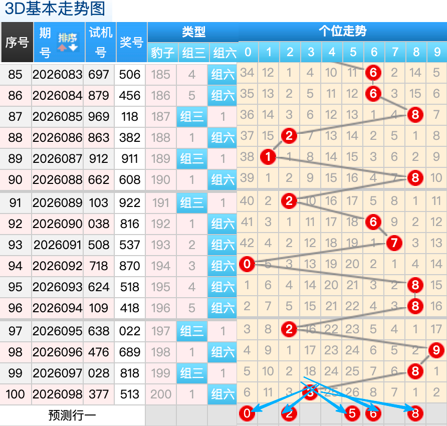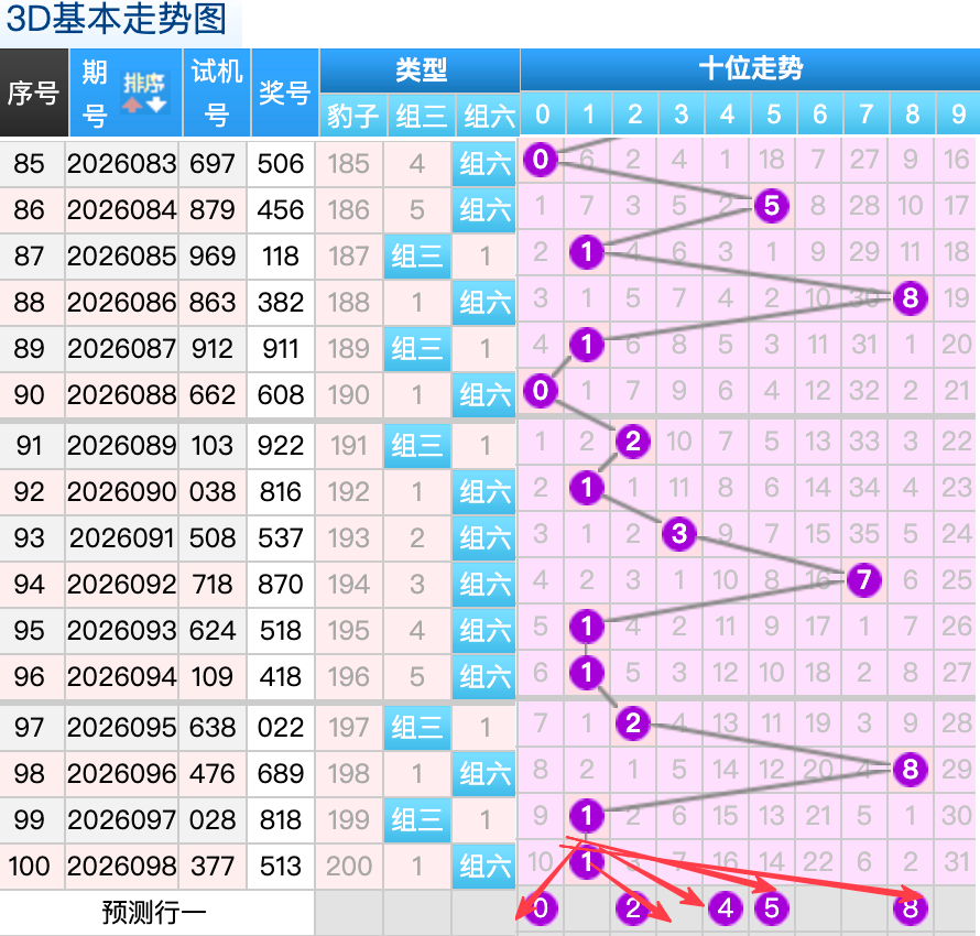 上期3D十位开出的奖号1号,上期在十位上1号球这个号码是一个重码回补码的落位点,本期来看2号在十位上要注意这个号码是有机会继续走出热号分边落位的趋势这里的号码回补形态注意防守就好,再来5号球这个点位注意防守走出3跨冷号码的落位趋势。0号球这个小周期号的分边落位回补要注意参考。8号球要注意走出折返的落位回补。