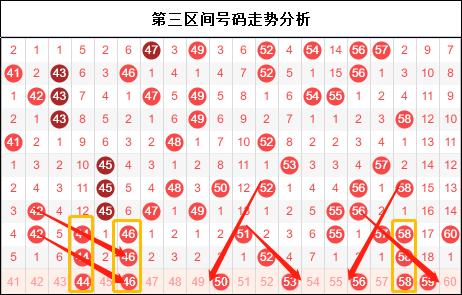 第三区间直接腰斩,但是金胆我们绝对是想到了,直接一个小三角出现。44和46是昨天忽略的两个号码,今天能不能再一次走出三重号,也是比较期待的事情。这一期整个走势上个数应该会维持一期,不要期望太高。在整体区间上还是会出现转移的走势。