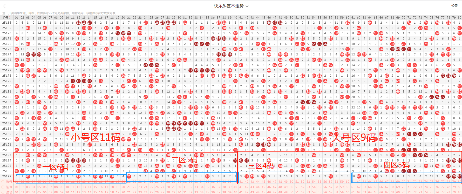 上图是快乐八2025197期区间走势图,从图中看到小号区(1-40)开出11个出奖号码,从开出数量上看与上期开出数量增长,热度延续,从小号区近10期出号情况看,整体小号区前区近期偏温趋势;大号区(41-80)本期开出了9个出奖号码,从近期出奖号码个数看属于偏温态势,下期快乐八20250198期大号区号码大概率热度反弹,大小区间主看大区号码热度反弹,大小比具体区间比可参考11:9,防10:10的比例;再从细分区间来判断,按走势图四分区分成四个区间,一区(1-20)开出来的号码有6个;二区(21-40)开出来的号码有5个;三区(41-60)开出来的号码有5个;四区(61-80)开出来的号码有5个;数据上看本期出奖号码集中分布在一区。从号码落位区间形态上看,快乐八20250198期主看二、三区热度回补的态势,出奖号码几率较大,需要密切关注。