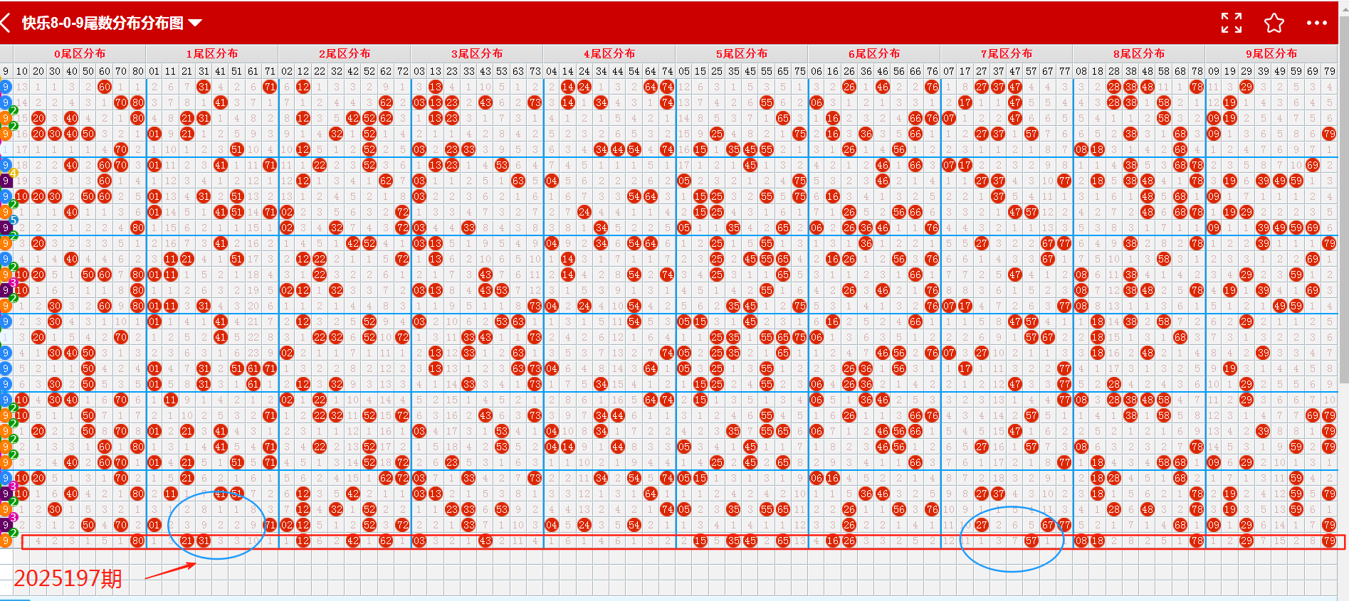 上图是快乐八2025197期的尾码走势图,从图中看0尾到9尾出号个数依次是:0尾号码区开出1个;1尾号码区开出2个;2尾号码区开出3个;3尾号码区开出2个;4尾号码区开出0个;5尾号码区开出4个;6尾号码区开出2个;7尾号码区开出1个;8尾号码区开出3个;9尾号码区开出2个;再看小尾号码(0尾-4尾)区有8码,大尾号码(5尾-9尾)有12码;数据比对统计后可以看到5尾出号数量最多,开出了4个中奖号码。本期4尾出现断区!由走势比对推断20250198期重点需要关注1、7尾区号码下号热度和增加的概率较大。