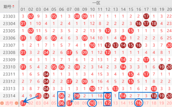 该区间的01号数字我们在跟一期,不出我们就直接放弃了,上期开出了03 04号数字,有可能把本期的01号数字带出来的,我们要注意一下。上期开出了04 06 08号数字,本期我们要注意一重一夹的号码,重点关注一下06 07号数字的出号情况。本期的10号数字是属于空三中心号码,本期的空三中心号有三个,我们要注意出一个号的情况。本期的12号数字我们防守一下出重的情况。上期开出了三连18 19 20号数字,本期有可能断号,我们要防守一下就行了。