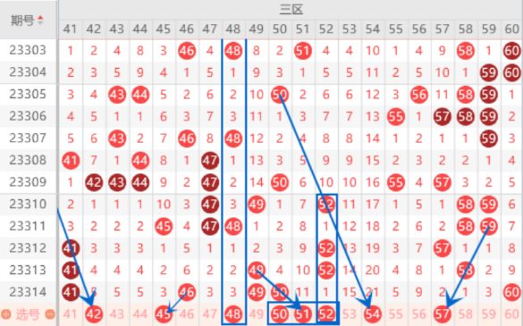 上期直播就说过了42 43 44有断号的风险,最好是本期来做号,所以本期的三连号42 43 44号数字我们要注意落下一个号码的情况,重点关注一下42 44号数字的落号情况。上期开出了46号数字,本期我们要注意分边的情况,防守一下它本身走重的情况。该区间的三个冷号51 53 54号数字本期我们要注意了,本期这里应该是要出一个号码的,可以在这里定一个胆码,重点关注一下51 54号数字的出号情况。