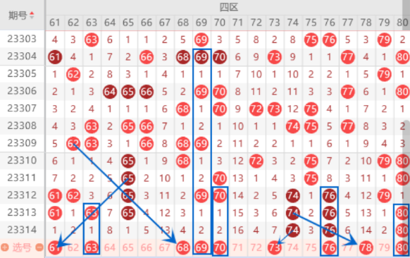 该区间的63号数字本期我们要注意出号的可能,最近63号数字空一出的次数越来越多了,值得我们注意一下。本期的68号数字我们关注一下,上期的走势很好,但是没有出来,本期有可能会出现回补的,注意68 69 70号数字开出三连的情况。上期74 76都走了三重号,本期我们要注意有一个走四重的情况,最近的4重号开始有点多了,这个我们要重点观察。本期的80号数字我们要注意走三重的情况。