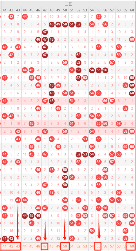 三区:最近三区10期出号情况为:4 4 3 3 7 7 10 5 2 5,总出号情况为49个,平均出号4.9个,本期三区号码走势比较不错推荐:41 42 43 47 50 55 60。重点关注:41 43 55 60。