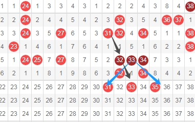 上图是福彩快乐8开奖号码走势分布图其中一部分,我标注出来的数字31 35看蓝色小箭头表示的都是斜连号码,数字33看上面标注出来的黑色箭头表示的都是隔一期的斜连号码,这里三个数字31 33 35。
