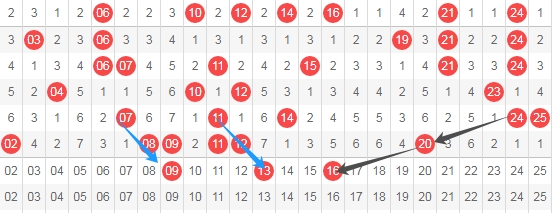 上图是福彩快乐8开奖号码走势分布图其中一部分,我标注出来的数字09 13看蓝色小箭头表示的都是斜连号码,标注出来的数字16看黑色箭头表示跨度4的斜连号码,这里三个数字09 13 16。