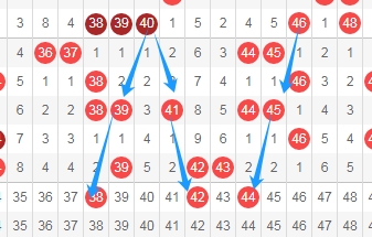上图是福彩快乐8开奖号码走势分布图其中一部分,我标注出来的数字38 42 44看蓝色小箭头表示的都是跨度二的斜连号码,这里三个数字38 42 44。